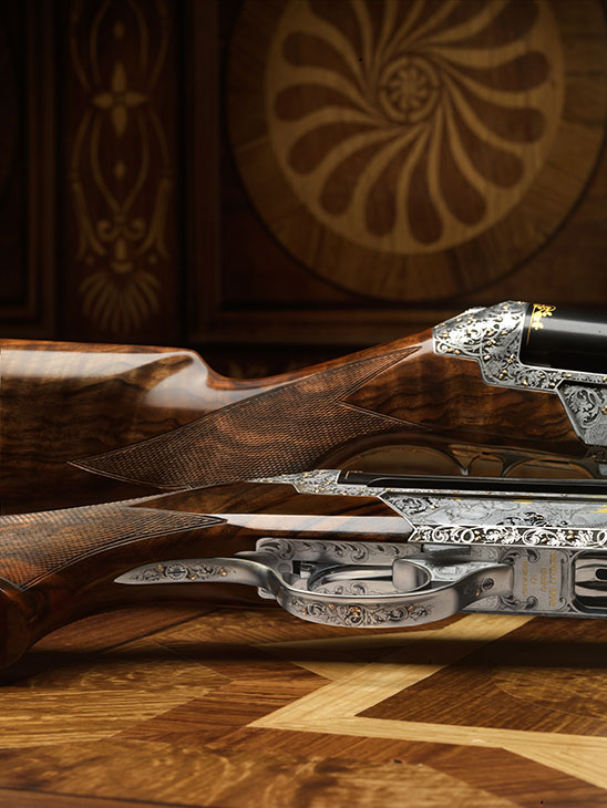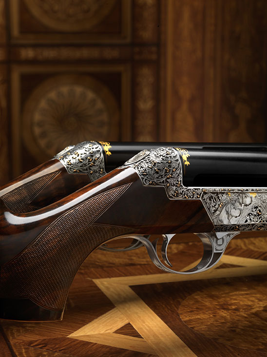 The engraver’s art hits its crescendo in the firearm world under the direction of Giovanni Steduto and Valerio Peli, master engravers from Creative Art Laboratorio Incisioni, one of today’s most renowned firearm engraving bottegas. Steduto and Peli hand-engraved each of the Set of Five receivers with inspirational scrollwork and modern interpretations of classical hunting scenes inspired by the aristocratic hunting traditions.