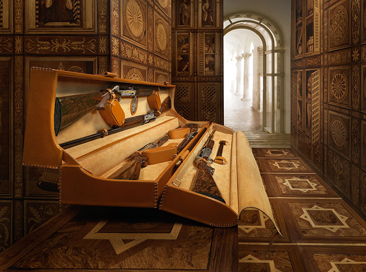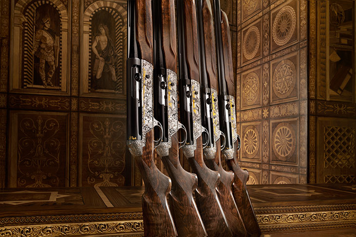 The Magnifico Set of Five stand as unique creations that draw on the rich tapestry of Italy’s culture, innovation, and the renowned craftsmanship born of the country’s unparalleled artisan heritage. The result is a masterfully creative achievement—functional art rendered in wood and metal. Classical forms long expressed by artists through the Golden Ratio are represented in the trigger guard’s flowing lines, gracefully curved receivers hint at the courtyard arches of the Ducal Palace in Urbino. From muzzle to stock, Italy’s artisan gunmaker craft reaches the apex of classical style and contemporary engineering in the Set of Five.