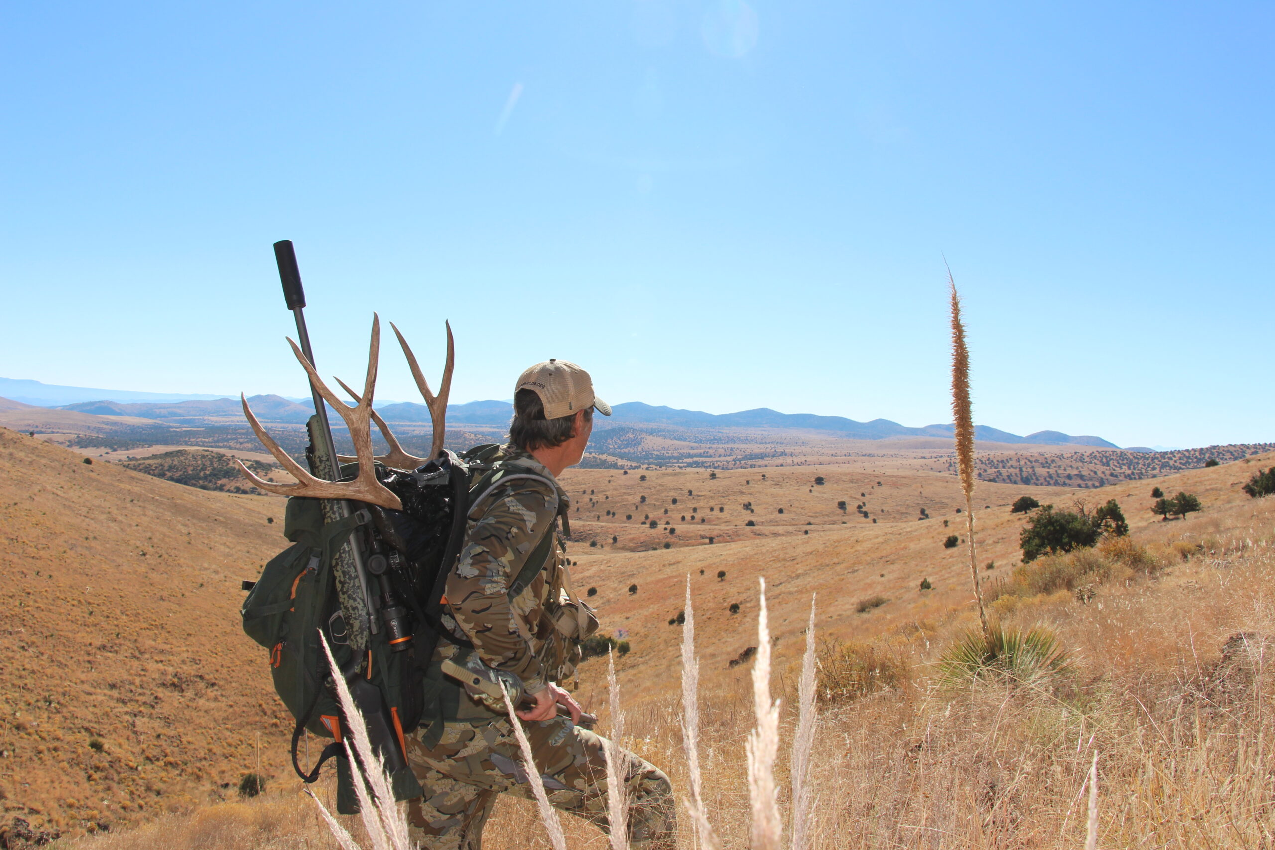 Author John Geiger looks southwest toward Arizona and Mexico as he packs out a mule deer from the foothills of the Gila Mountains near Silver City, New Mexico.