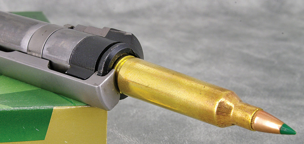 The Mauser extractor is what makes controlled-round feeding possible. It doesn’t rotate with the bolt, and a flush bolt face allows the rim of the feeding cartridge to slide up behind the claw as it clears the magazine’s feed rails.