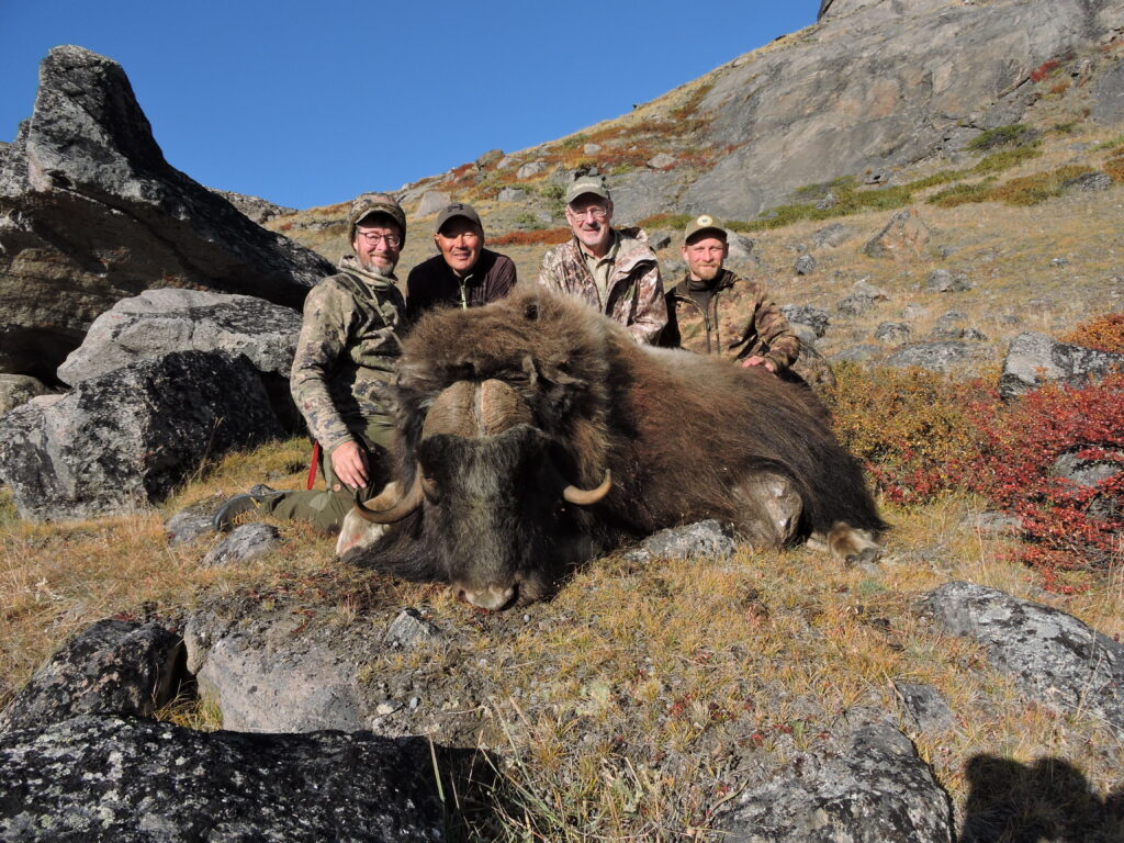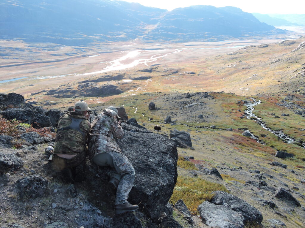 About halfway through our stalk up the mountain, we heard a few shots. Their bull had started to travel up the river and T-Claude was forced to take the shot. Luckily, our muskoxen were far enough away that they didn’t react to the shots. As Enok and I approached the herd from above, we could only see one cow until we crested a small ridge. The big bull was only 80 yards below us. Enok motioned to a boulder 15 yards to our left, and we crept closer. Soon, I was on a perfect rest, waiting for the bull to turn broadside. After waiting for an eternity, he finally turned offering a shot. Thinking back to the instructions from the guides, I bisected the hump and came halfway down the body and squeezed the trigger. The bull immediately dropped and struggled to regain his feet. He eventually stood up, and a final shot put him down for good.