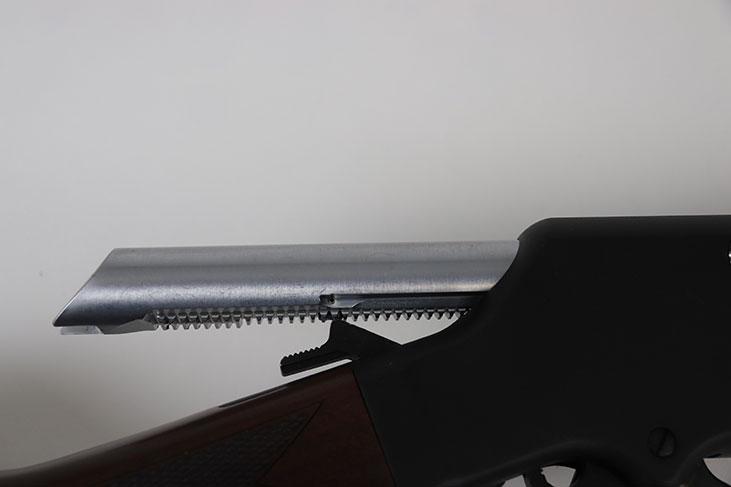 The forged steel lever works on a rack-and-pinion-type gearing system that smoothly moves the six-lug rotary head bolt into a rear extension of the barrel to provide strong and consistent lockup. The Long Ranger has a safety that is a sliding, in-hammer transfer bar instead of the usual manual safety button.