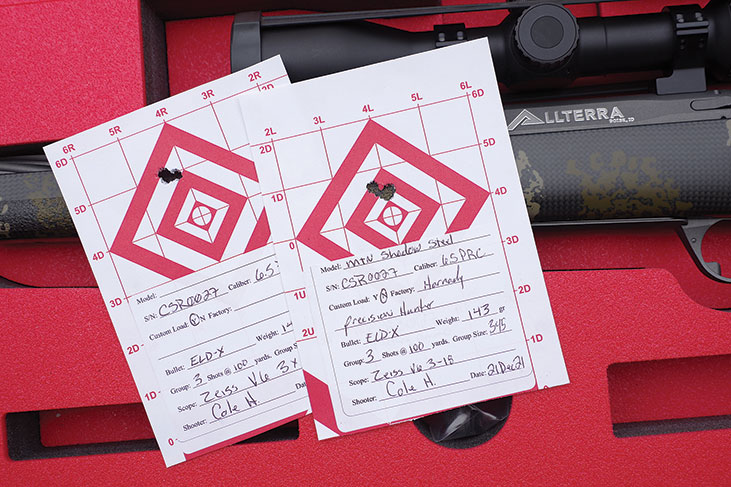 To say I had high expectations would be understatement. Range conditions were fairly good at the outset — 62 degrees with a 4-6 mph wind, but it was pretty much parallel and fairly steady, so I didn’t think it would be a big factor. Starting with the ELD-X hunting load, my first 3-shot group confirmed that the gun had been zeroed dead-on at 100 yards, as all three shots were inside a 1 1/4-inch black circle. Wanting to give the gun every chance to show its stuff, I let the barrel cool about six minutes between groups. The barrel never got more than mildly warm to the touch. I was disappointed in that the next four 3-shot groups averaged 1.28 inches discounting one flier that was my fault. That’s fine accuracy for a hunting rifle, but I expected more. However, the fact that this rifle just didn’t like Hornady’s ELD-X Hunting load was no big thing; every rifle is unique. You just have to find out what they do like. But things were about to change…radically!