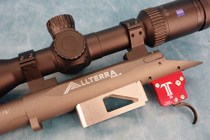 The standard bottom metal unit is a one-piece non-ferrous CNC-machined affair with a straddle-style hinged floorplate. Like the receiver, it’s fully glass-bedded. Allterra’s short action, on which the 6.5 PRC is based, will accept cartridges just a hair short of 3 inches. If you prefer a detachable magazine, that’s available as an option.