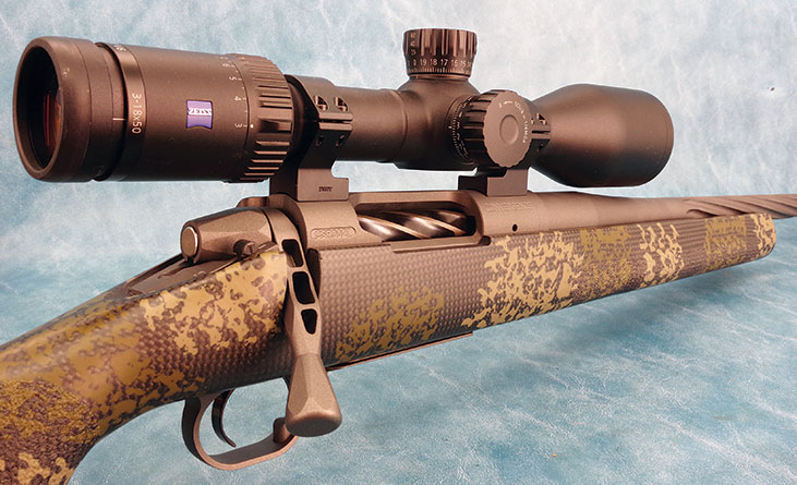 A Remington 700-type trigger by TriggerTech is the fire control system, and the standard issue is that company’s Primary model factory-set at 2 pounds. However, five other added-cost trigger options are offered, two more by TriggerTech, and three Timneys. Our test gun came with TriggerTech’s Diamond unit which adds $145 to the rifle’s basic price of $5,495. It features a 2-position side safety that blocks trigger movement but does not lock the bolt. The bolt stop/release is an unobtrusive lever at the left side of the receiver bridge.